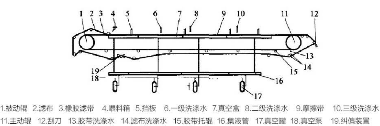 該設(shè)備采用了固定真空盒,膠帶在真空盒上滑動(dòng),真空盒與膠帶間構(gòu)成運(yùn)動(dòng)密封的結(jié)構(gòu)型式。以濾布為介質(zhì),使料漿水平布置于過濾介質(zhì)之上,充分利用料漿重力和真空吸力實(shí)現(xiàn)固液分離。它能連續(xù)自動(dòng)完成過濾、濾餅洗滌、卸渣、濾布沖洗等工藝操作,并且母液、濾餅洗滌液可以分段收集。